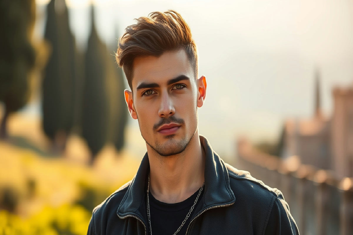I capelli e gli occhi castani completano un look pulito e classico, perfetto per il mondo della moda maschile. Il suo aspetto curato lo rende adatto a passerelle, campagne pubblicitarie e servizi fotografici.